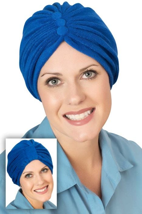 These comfortable terry cloth turbans can be worn in two ways, for two different looks. Made from a super soft and stretchable terry cloth material with a higher cotton content than our competitors. Plush, premium fabrics make this turban super comfy. Three buttons give this style an interesting look. Pair it with casual wear for a simple look that is easy to love. It's perfectly suited to wear indoors and out. This turban provides total head coverage for women with hair loss due to cancer, chemotherapy, alopecia, or other types of medical hair loss conditions. It is soft to the touch, making it ideal for those wearers with sensitive scalps. See our photos for more ways to wear this every day look.