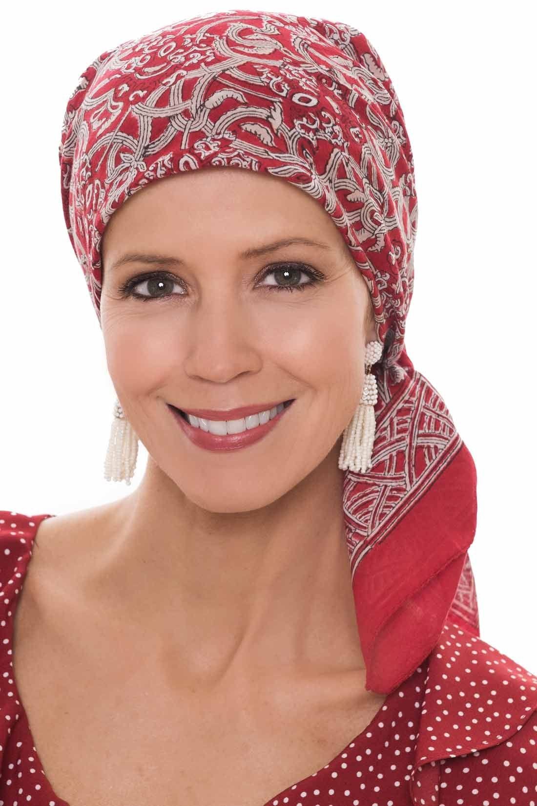 These 100% cotton woodblock printed head scarves are another Headcovers.com exclusive. Fashioned in the hard to find 30.5 inch square size, perfect for easy scarf tying around the head. Our Woodblock head scarves all come with FREE scarf tying instructions. All head scarf prints and colors were designed by Danielle Yates, especially for cancer patients and women with hair loss due to other types of medical conditions. They're also great for anyone looking to add some fun and versatility to their headwear wardrobe. The color and design options are all so versatile, making it easy to find one to match your particular wardrobe needs. The soft cotton material feels soothing on the head and is perfect for women with sensitive scalps. When tied, this scarf provides total head coverage, perfect for women with hair loss due to cancer, chemotherapy, alopecia, or other hair loss conditions.