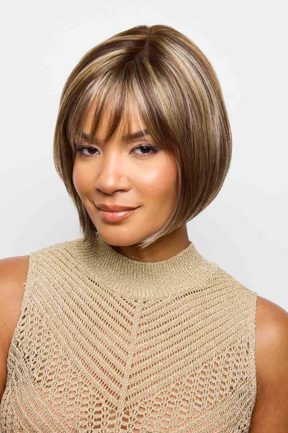 Imagine hair that feels like a soft breeze at chin level: Wynn delivers with breezy, feathered layers—front fringe around 3.9″, crown about 8.3″, and a tucked 3″ nape. The feel is light and lively, with smooth, straight strands that gently turn under at the ends. The fringe brushes just above your brows, framing your gaze, while the layers provide effortless body and movement.