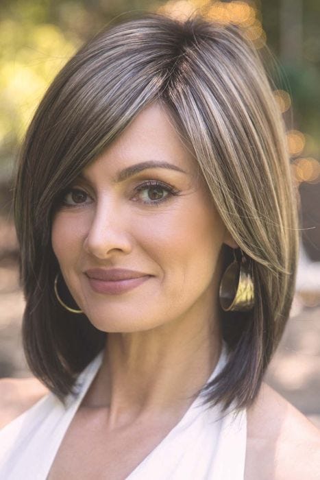 Zane by Noriko is a medium-length synthetic wig. This wig features shoulder length, long layers with tapered side-swept fringe bangs. The long layers help frame the face and provide a stunning silhouette. The lace front adds a realistic hairline complete with the appearance of new hair growth. A monofilament part provides natural movement at the hair part.